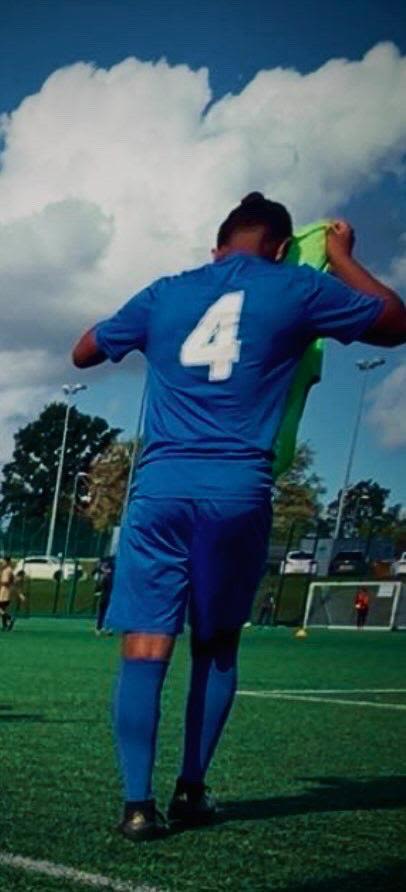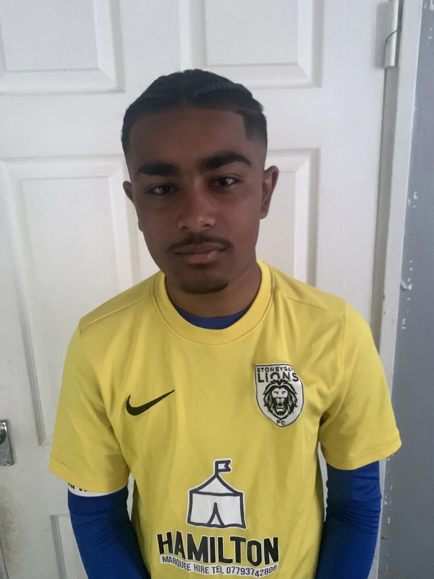 Jamie Dhada wearing his team’s football t-shirt.