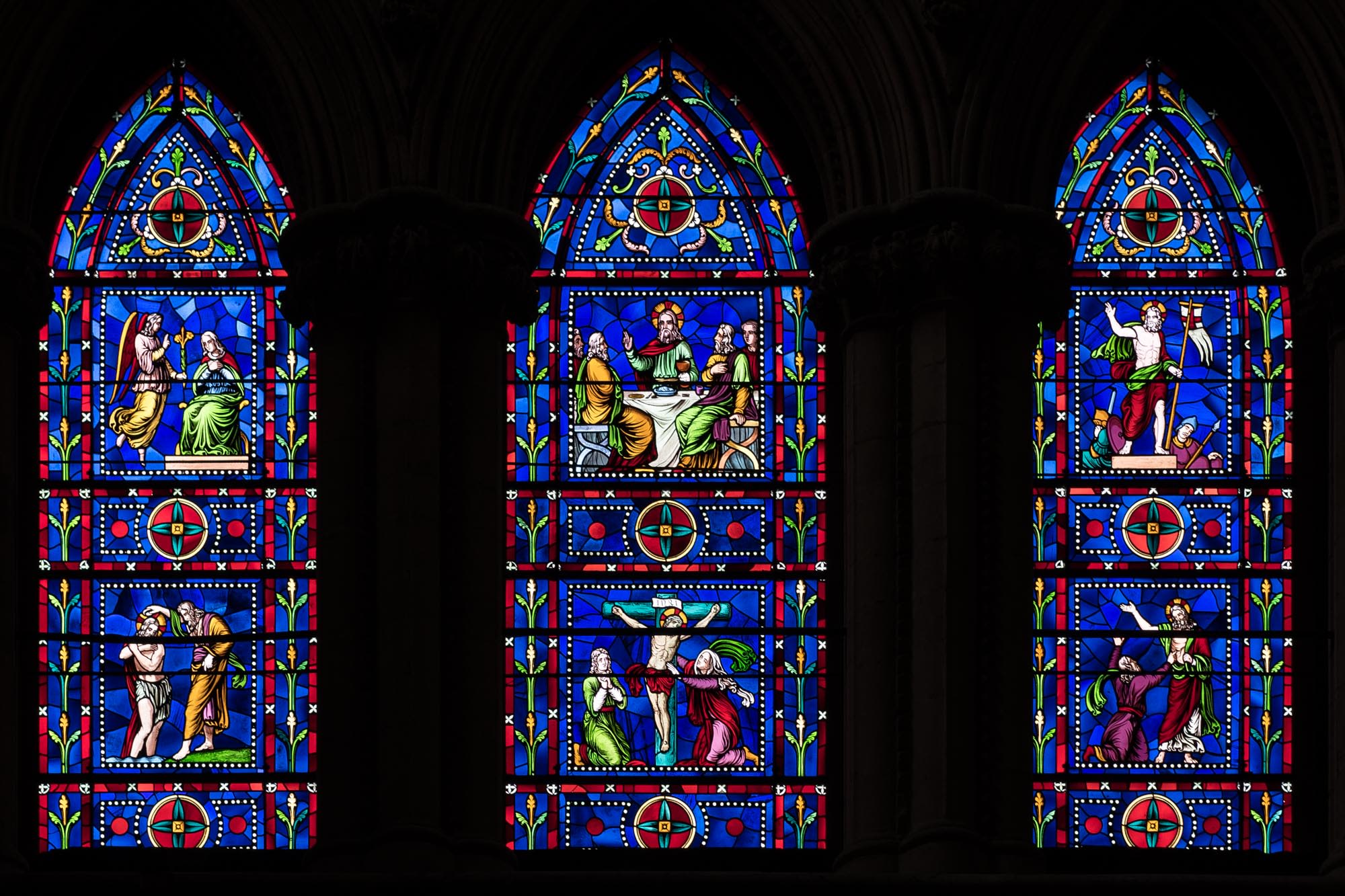 Each limestone carving told an 11th century story of pure grit and hard work, religion and political power, but the inside of the cathedral told a thousand more stories. The ceilings stood 82 feet tall and plastered with intricate paintings depicting scenes from the bible, each one lined in remarkable gold frames. The stained-glass windows shone every colour of the rainbow, with the sun bursting through them reflecting pockets of multicoloured light over every surface.